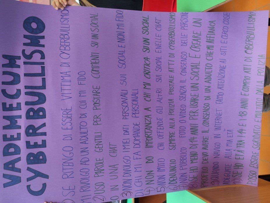 The teachers accompanying them were very satisfied: “The project helped work on relational skills through teaching methodologies like Circle Time, Cooperative Learning, and Role Play,” says the teacher Silvia Dalli Cani. “The students managed to build and combine their ideas to plan a speech, a skit on cyberbullying, posters, and useful materials for the presentation.” Many key citizenship competences were developed. “Going beyond the classroom,” the teacher continues, “gave the students the opportunity to experience civic engagement and feel more responsible towards others and the community. The children were eager to explain and spread the rules in their Guide because these would then be seen and consequently help a larger number of people, including many young people. Posting the flyers in the shops and the request from the Middle School teachers to put up the flyers along their corridors and on the school bulletin board made them proud.”
